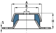 Rubber anti-vibration mount consisting of a base and a zinc plated bell cover.