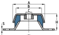 Rubber anti-vibration mount consisting of a base and a bell with zinc plated threaded nut.