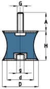 Plot antivibratoire en caoutchouc, caoutchouc métal, cylindrique avec deux armatures constituées par une vis et un écrou pressés sur rondelles zinguées successivement.